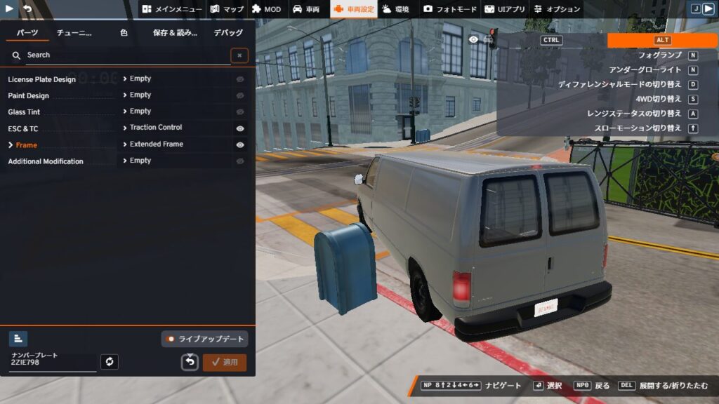 まずEキーから車両のパーツを選択し、カスタマイズ画面を呼び出します。