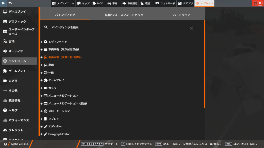 オプション画面のコントロールを開き、その中の【車両固有(未取り付け部品)】を選びましょう。