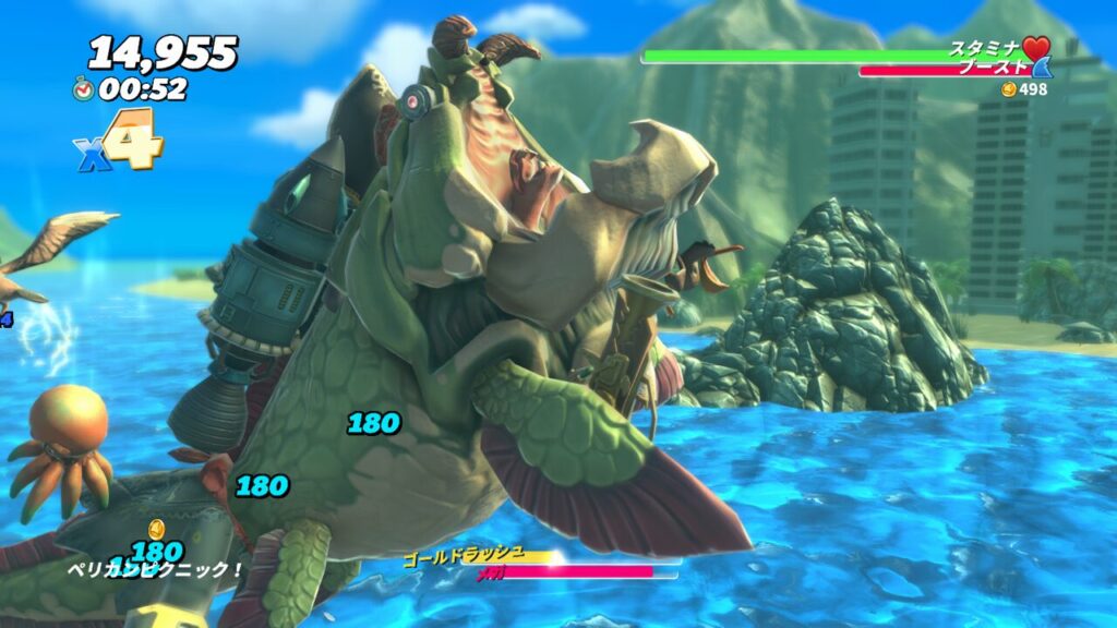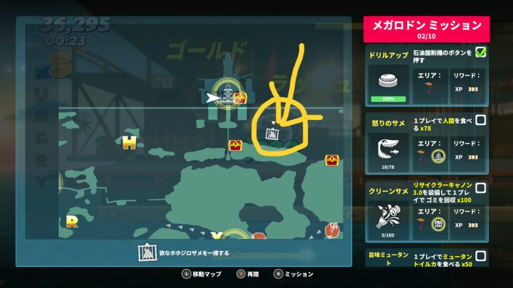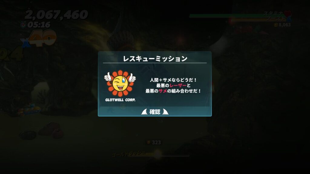 普通にシャークアタックしてるだけでも余裕で勝てますが、もし厳しい場合は周りに大量のエサがいるので、ゴールドラッシュ状態で戦うと更に楽に勝てます。
