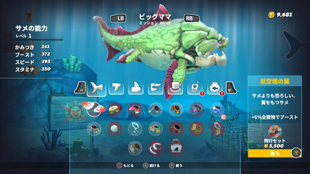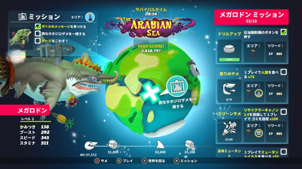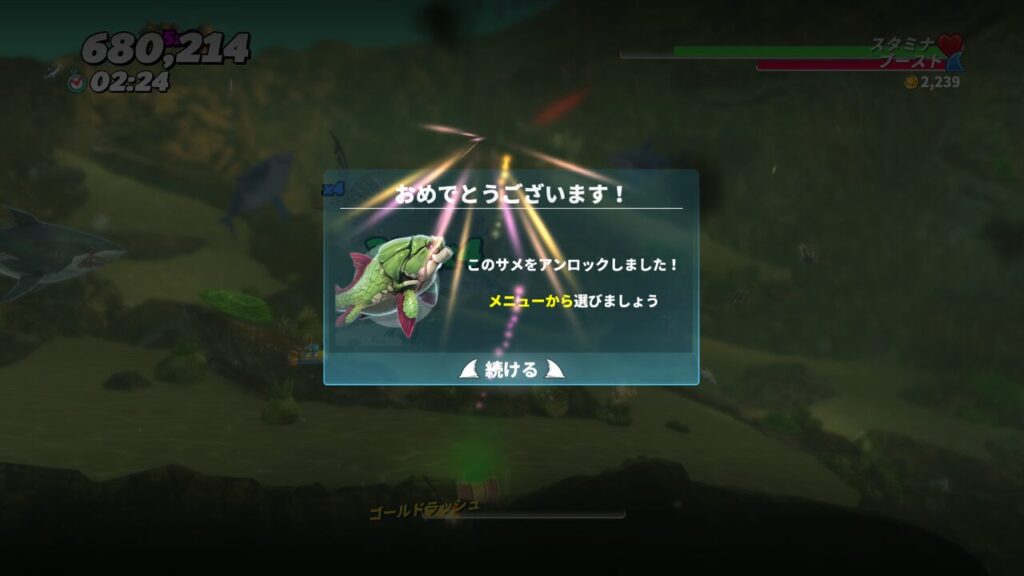 今回の敵である欲なホホジロザメは2体ほどしかおらず、しかも周りに捕食可能なエサが豊富なため、かなりイージーなボスでした。