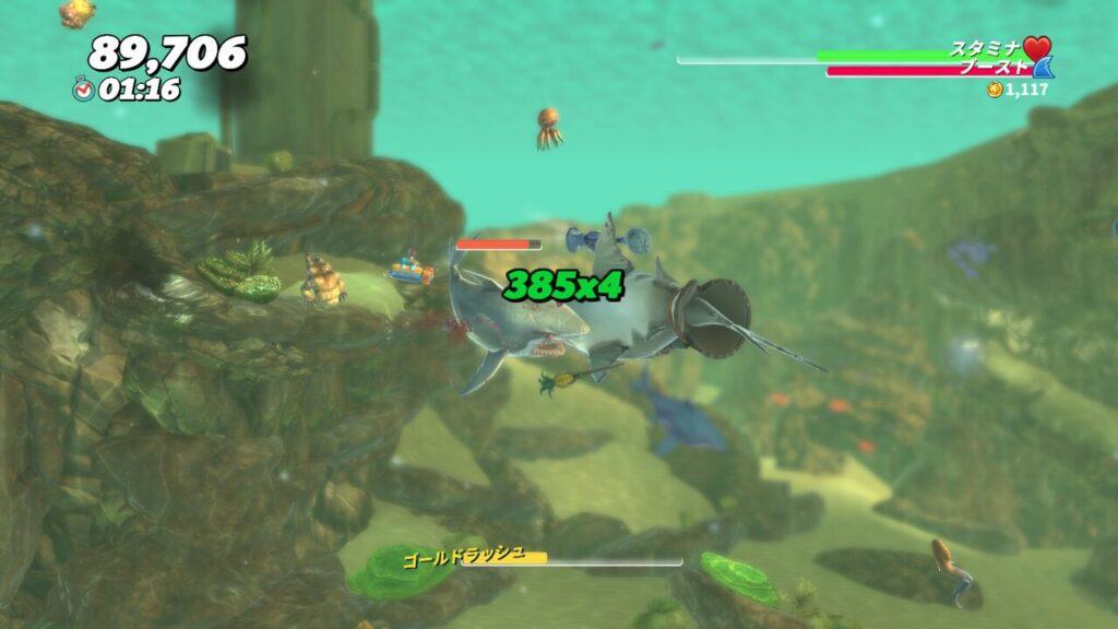 ボスエリアには捕食可能な魚やクラゲが多いので、簡単にゴールドラッシュ状態になれます。