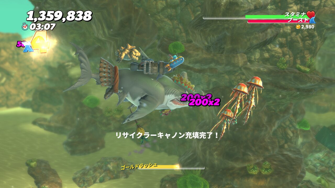 普通にシャークアタックしてるだけでも余裕で勝てますが、もし厳しい場合は周りに大量のエサがいるので、ゴールドラッシュ状態で戦うと更に楽に勝てます。