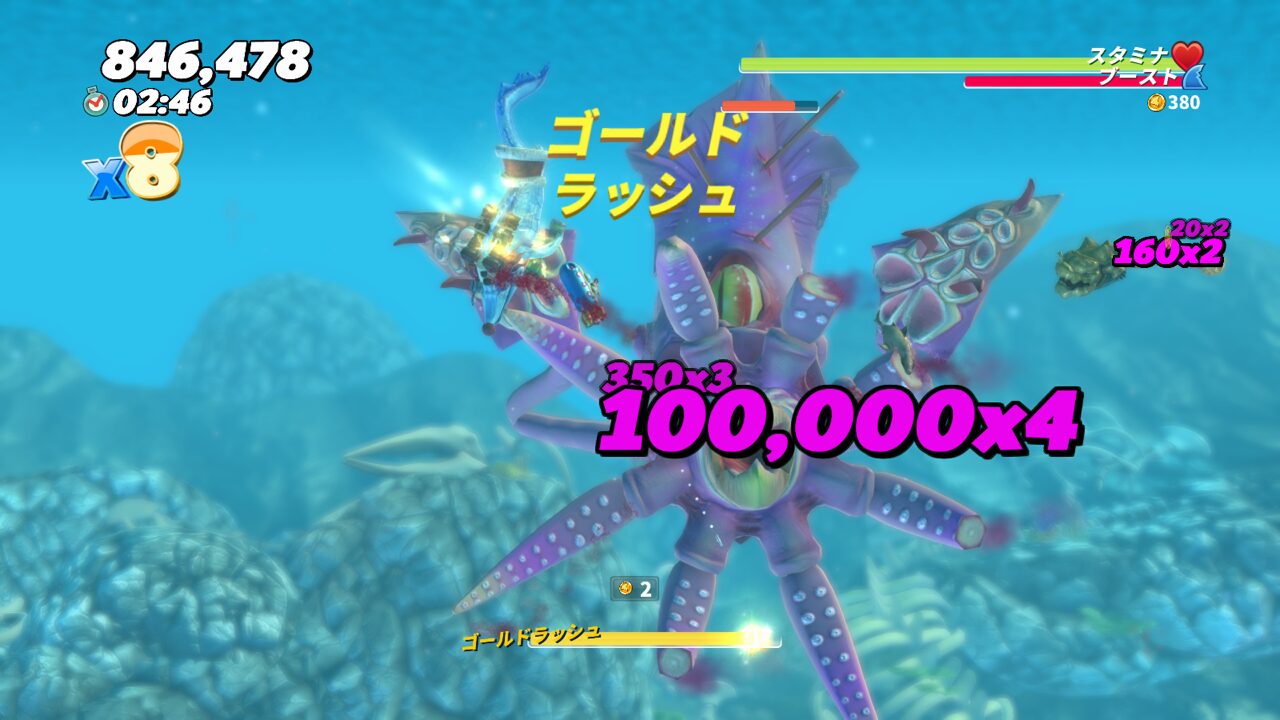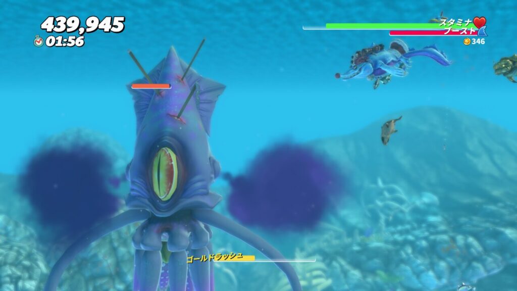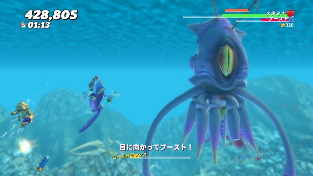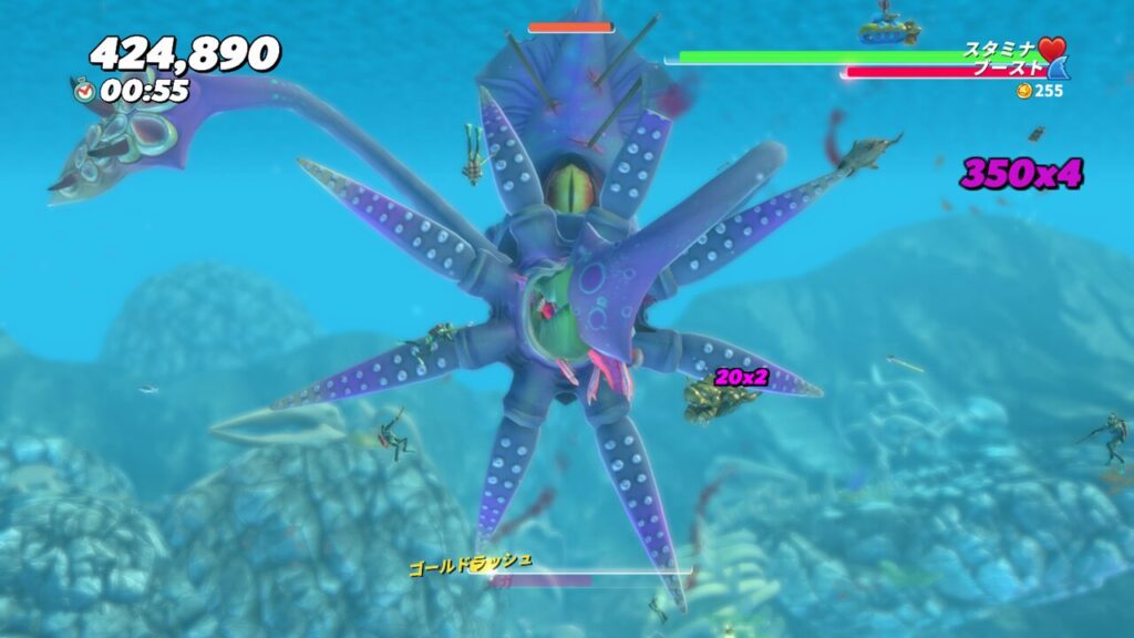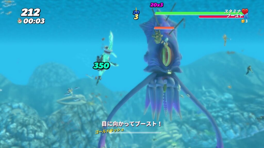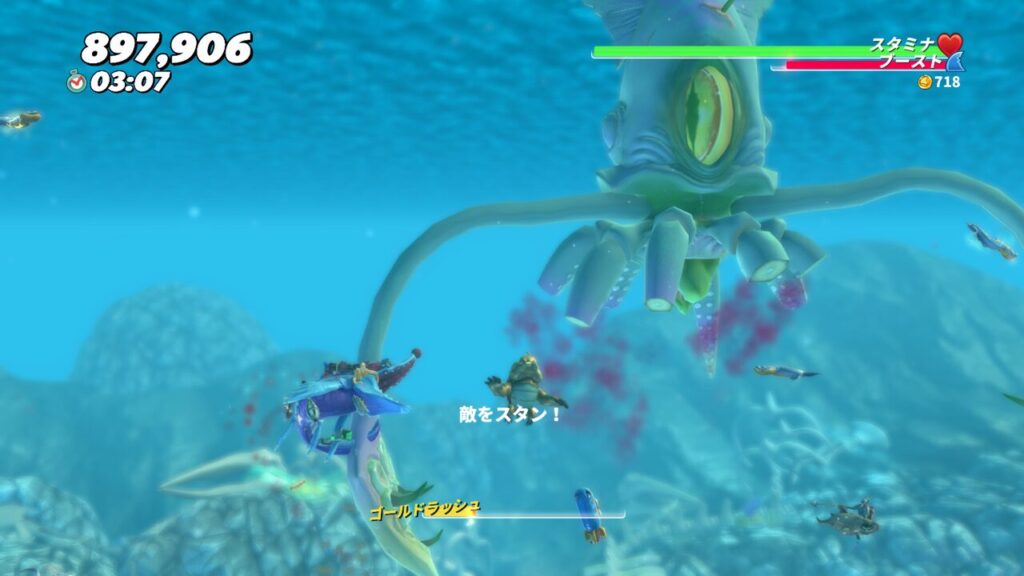 3発ほど目にブーストアタックを当てると、触手を広げてスタン状態になるので、その隙に触手にシャークアタックをして体力を削ります。