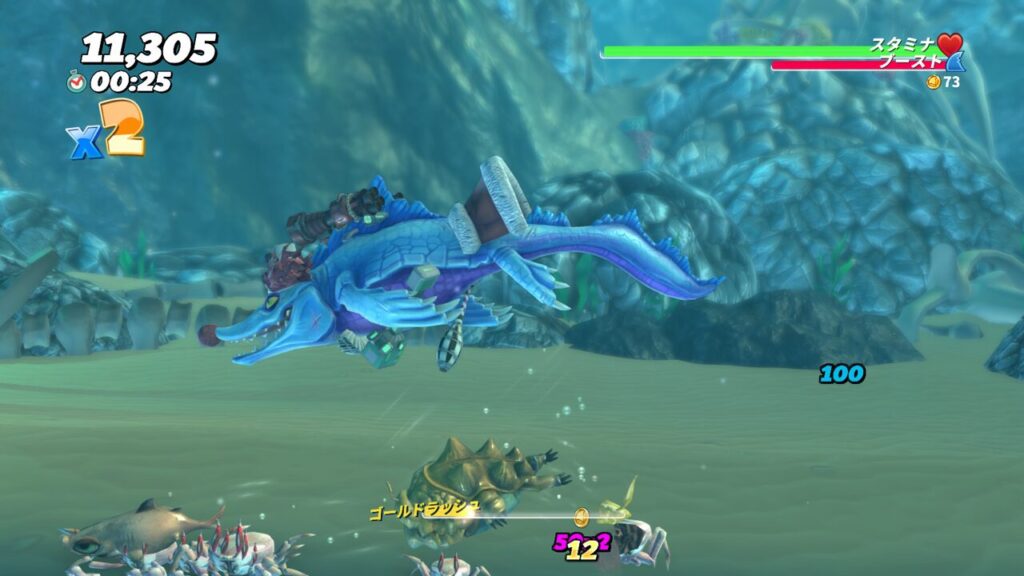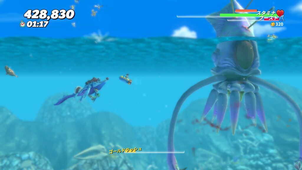 クラーケンステージの海底には多数の大型カニがおり、一見するとスタミナ回復に使えそうですが、海底にはいかないようにしましょう。