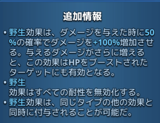 野生:3ターンの間、ターゲットと近くにいる敵がターン毎に296または592の燃焼ダメージを受ける。