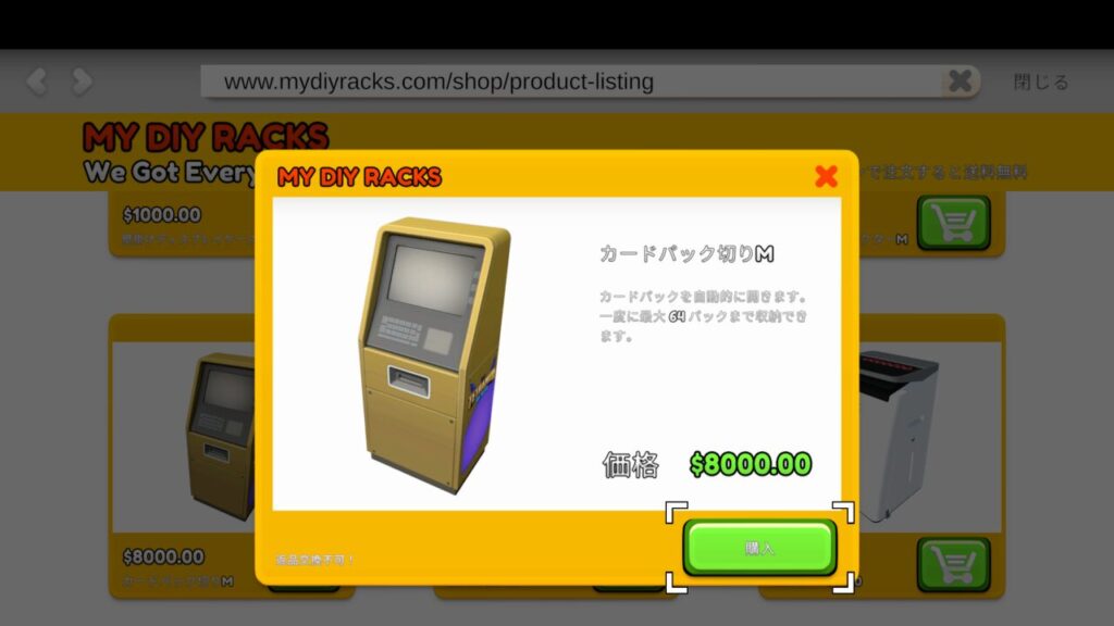 TCGカードショップシミュレーターにはMY DIY RACKSから購入できる【カードパック切り】という便利な機械があります。
