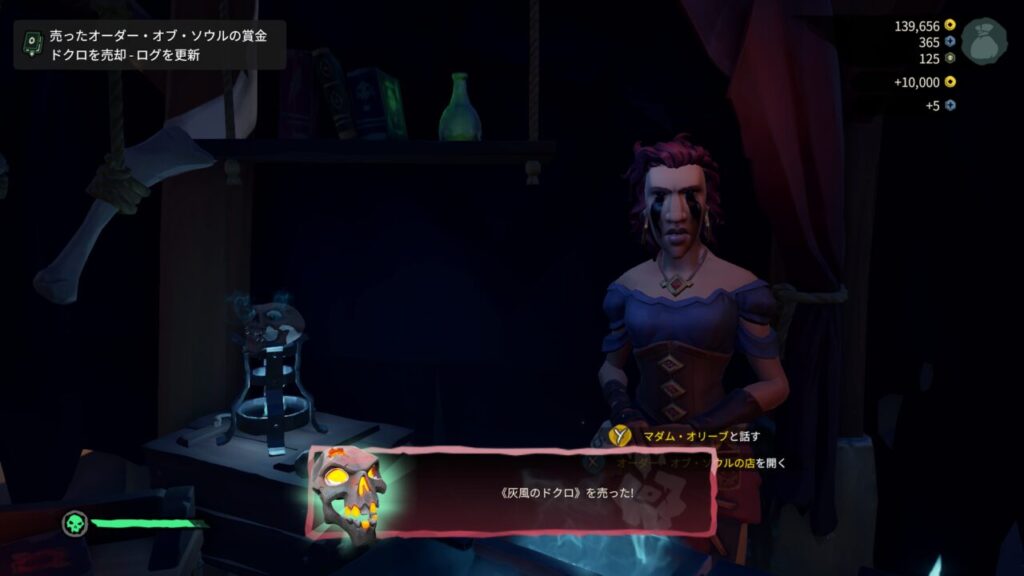 ↑灰風のドクロを開拓地のオーダー・オブ・ソウルに売却したら、なんと10,000ゴールドもGETできました。