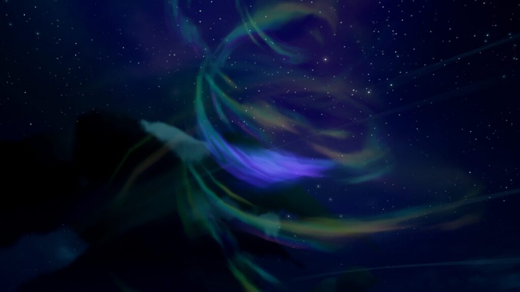 スタート地点から近くにあった【珊瑚の墓の祠】という場所にやってきましたが、そこには島などはなく、ただオーロラのようなエフェクトが漂っているだけでした。