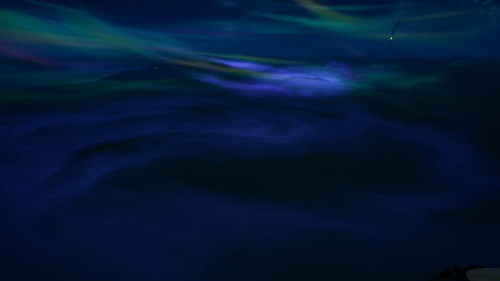 というわけで船から飛び込んで潜ってみましたが、やっぱり海底の方から何かオーロラのような輝きが上ってきてました。