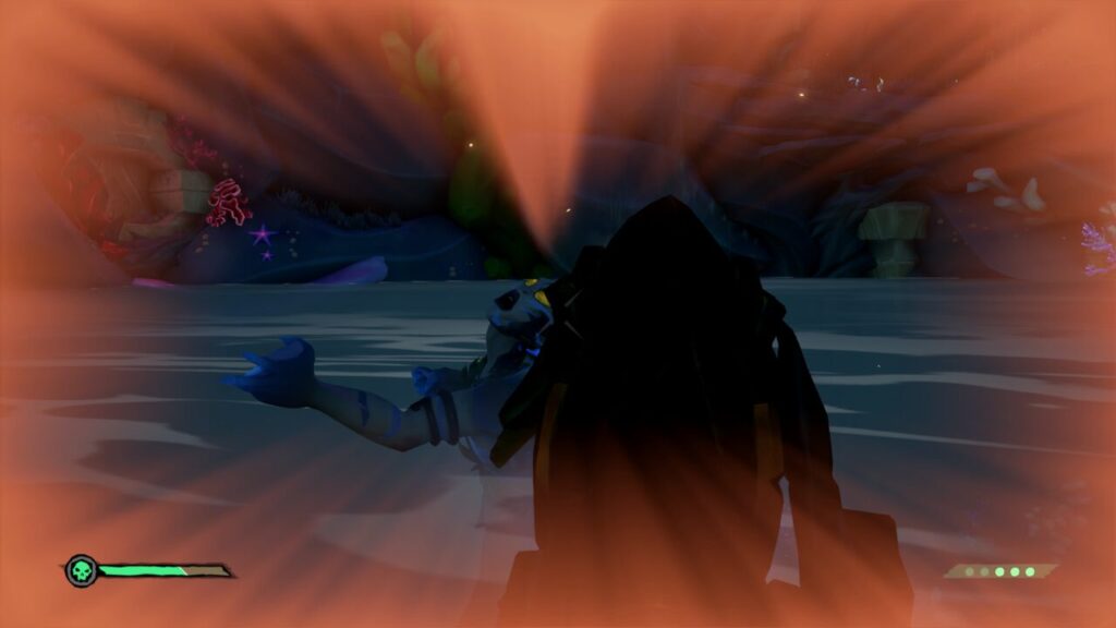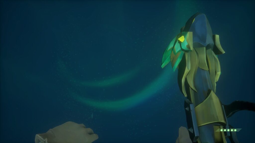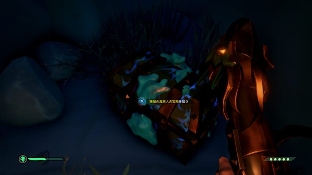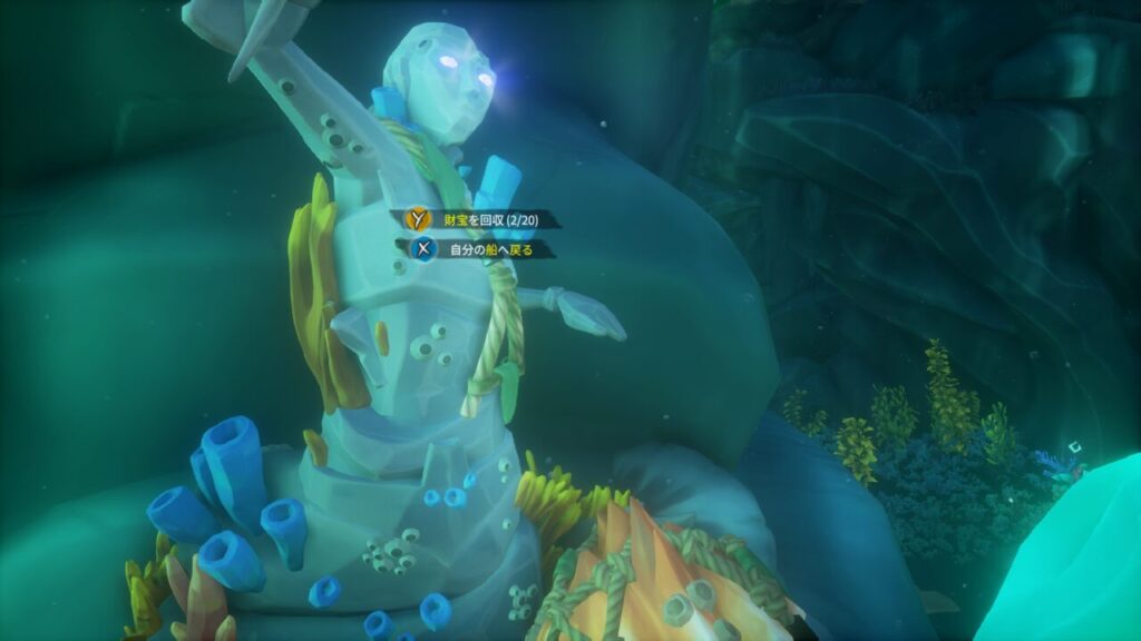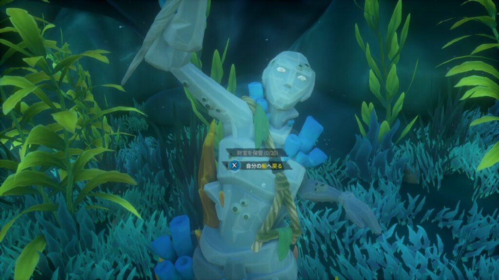 水中には何やら人魚の石像がいくつか沈んでおり、Yボタン長押しで宝箱やその他の財宝を預け入れる事ができ、Xボタン長押しで自分の船に戻れるようです。