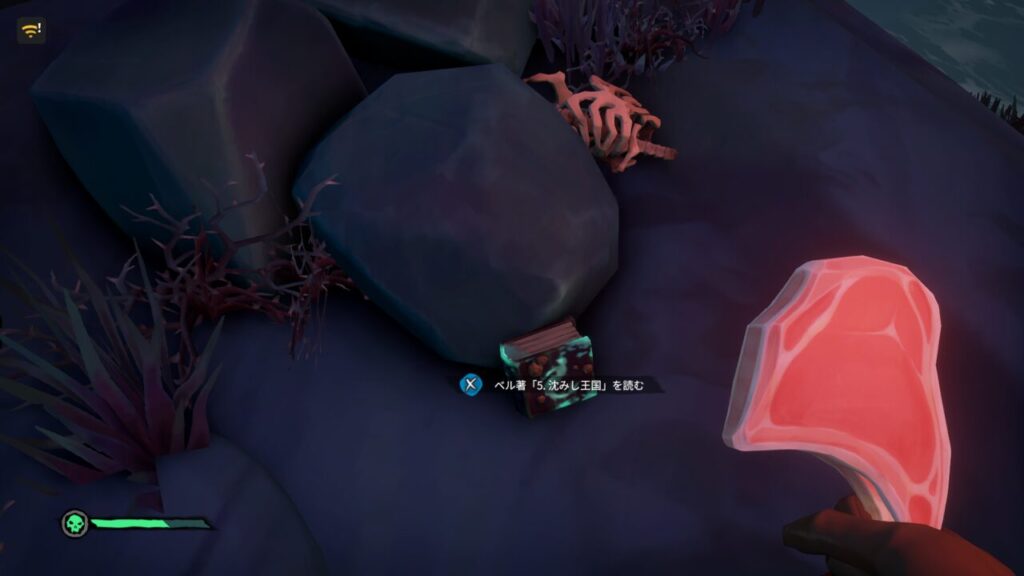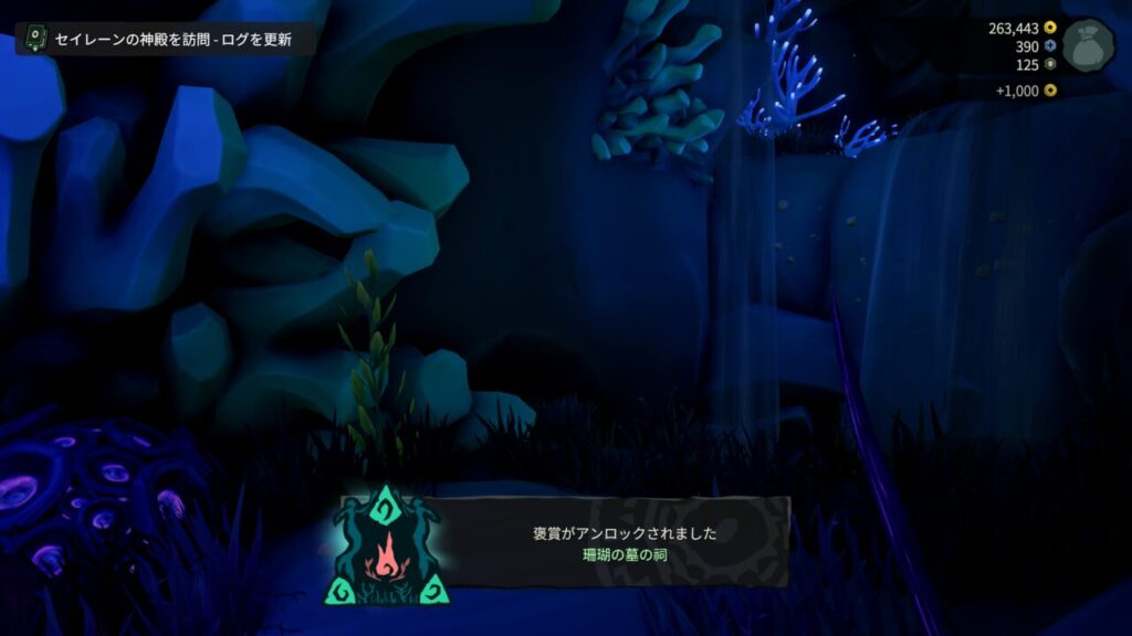 セイレーンの神殿内には、【ベル著】系の本がいくつか落ちているのですが、たまたまなのか全部読んだタイミングで実績(トロフィー)【珊瑚の墓の謎】がアンロックされました。