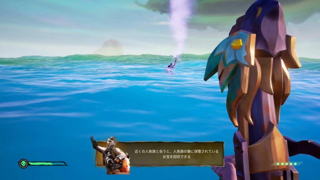 ↑船に戻るとジャーナルで「近くの人魚族と会うと、人魚族の像に保管されているお宝を回収できる」と表示されたので、船上から人魚族を探してみました。