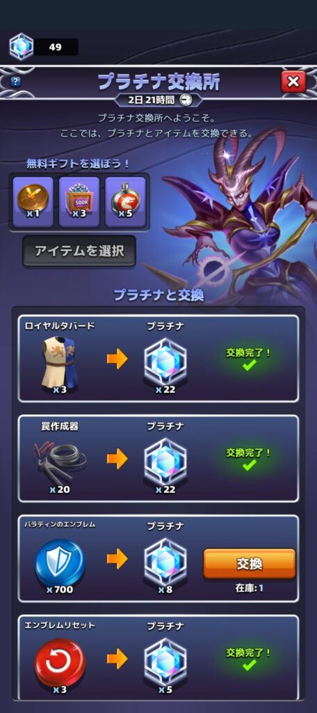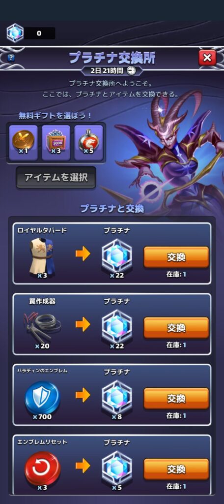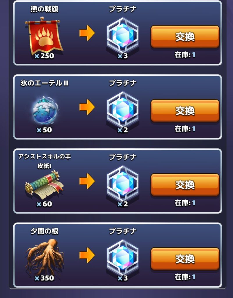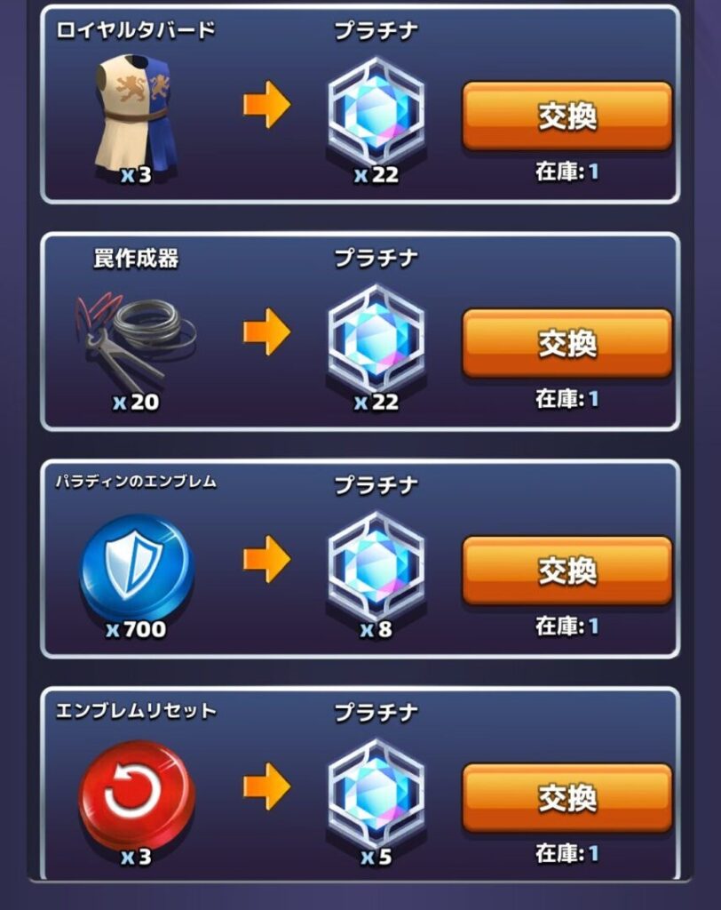 とりあえずいくつかのアイテムをプラチナに交換してみましょう。