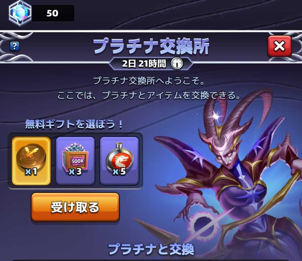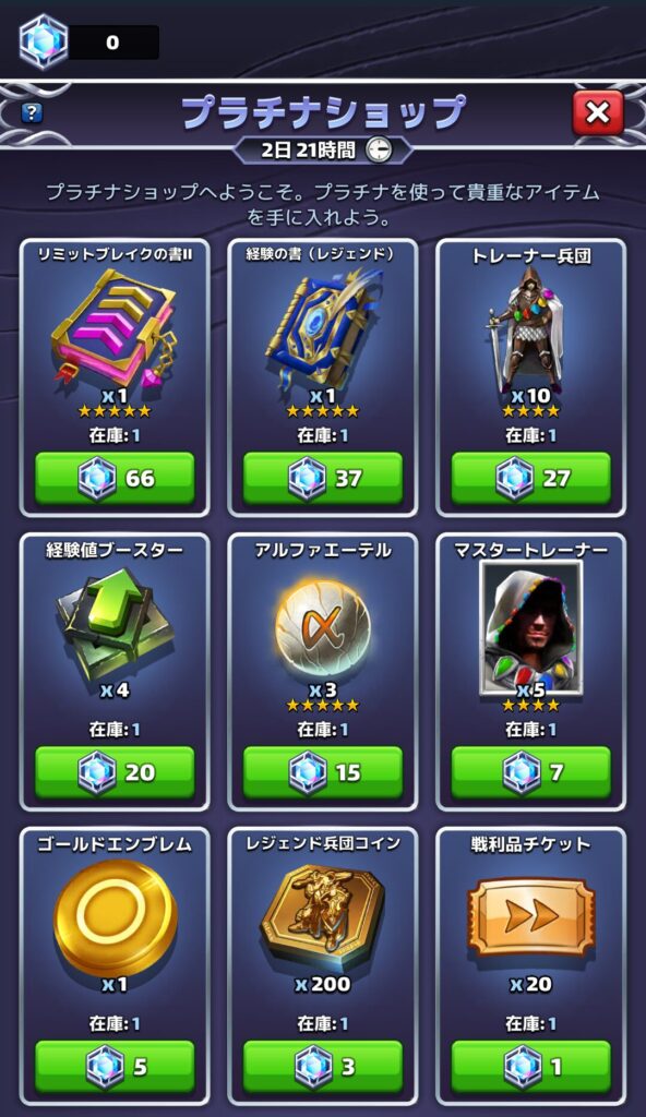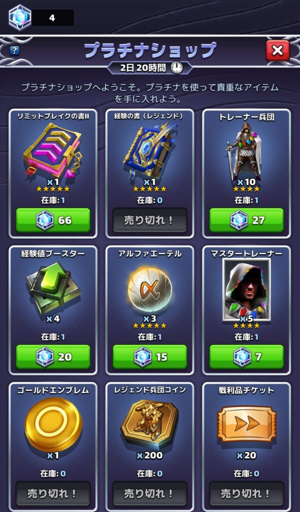 プラチナ3個でなんとレジェンド兵団コインが×200枚得られるので、これだけでレジェンド兵団サモン2回分です。