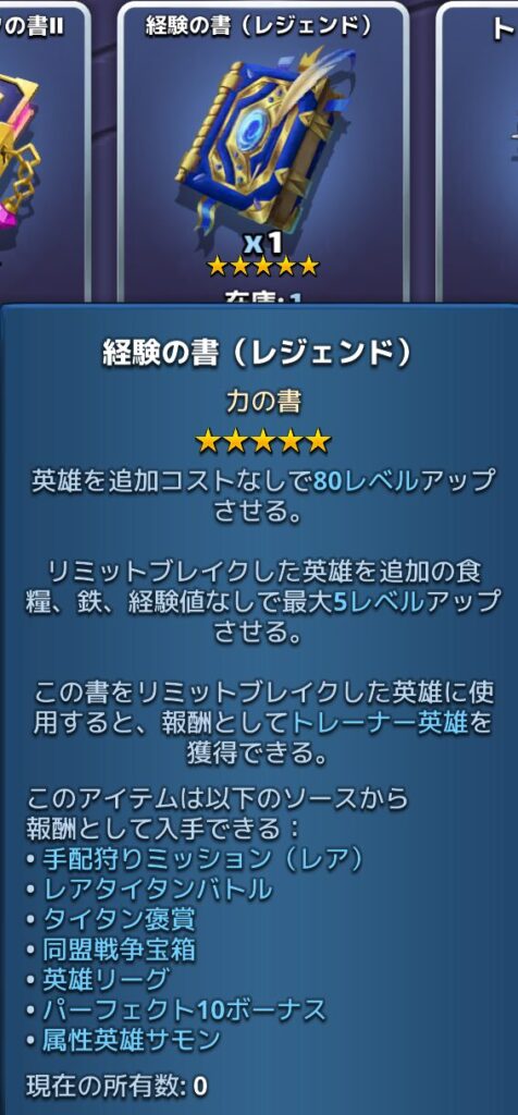 筆者がエンパズ界で最も好きなアイテムがこれです。当記事執筆時にも経験の書(エピック)はいくつか所持しておりますが、レジェンドは久しく手に入れていない超レアアイテムです。