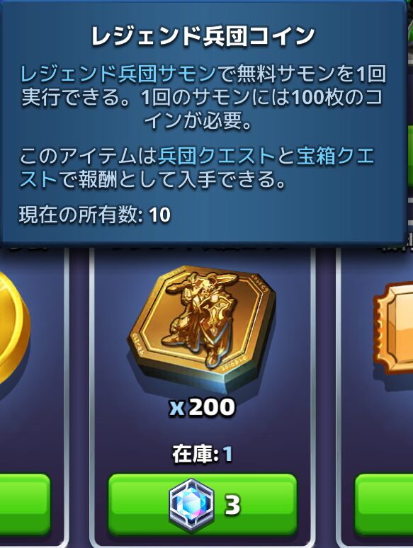 レジェンド兵団コインは、100枚でレジェンド兵団サモンを無料で1回引ける。