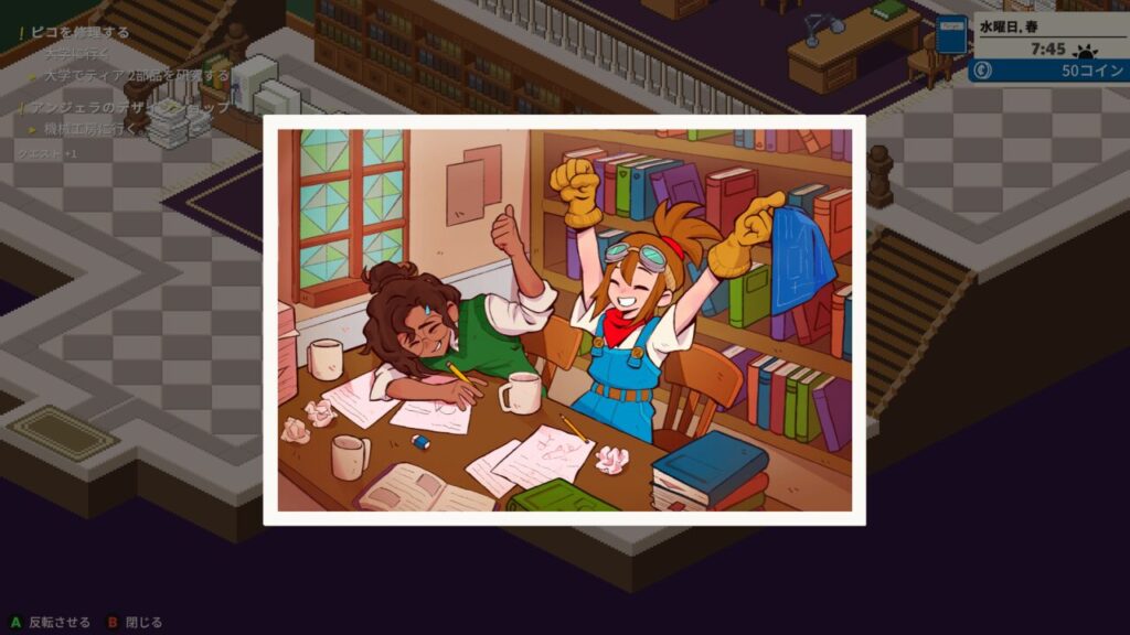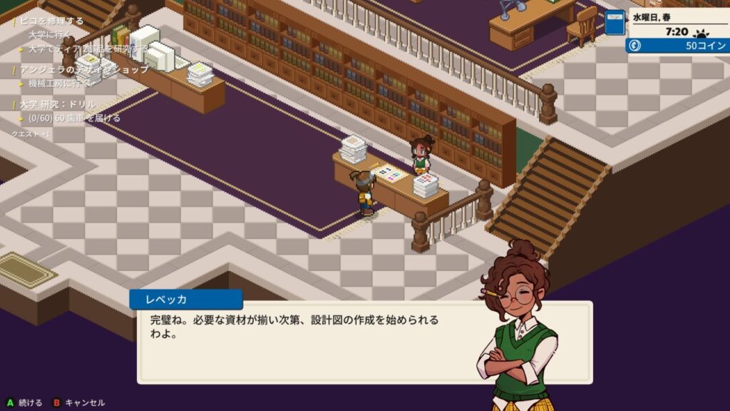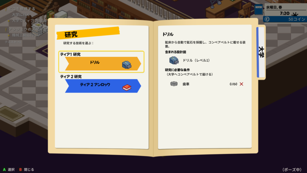 大学では新しいアイテムや装置の設計図の作成を始められる。この新アイテム開発はゲームの肝となるので、積極的に進めよう。